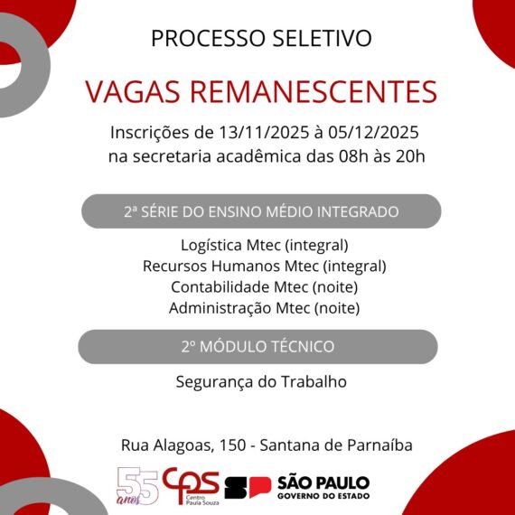 As inscrições para o processo seletivo para as Etecs do Centro Paula Souza (CPS) para o 1º semestre de 2026 iniciam-se no dia 10 de setembro e encerram-se no dia 3 de novembro. O exame será aplicado […]